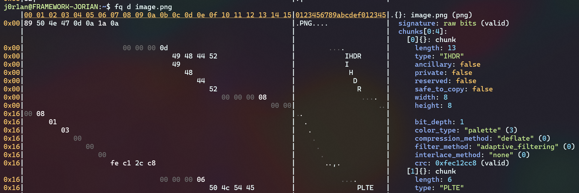 <figure><img src="https://3698848315-files.gitbook.io/~/files/v0/b/gitbook-x-prod.appspot.com/o/spaces%2F677wrA8ZfiPs1U4l5uR6%2Fuploads%2ForaKL4o9cr30YZ6G8t4Z%2Fimage.png?alt=media&#x26;token=a0dc5080-c916-4506-9862-e4d7d70ebdd7" alt=""><figcaption><p>Example fq output show chunks of PNG</p></figcaption></figure>