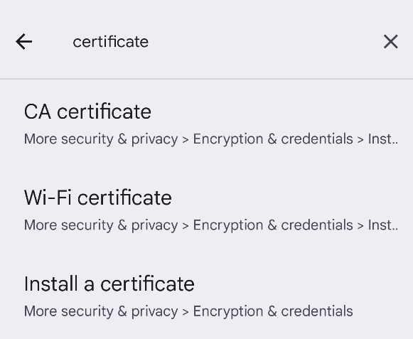 <figure><img src="https://3698848315-files.gitbook.io/~/files/v0/b/gitbook-x-prod.appspot.com/o/spaces%2F677wrA8ZfiPs1U4l5uR6%2Fuploads%2FY4TqSJbh4jAdWnVv55ca%2Fimage.png?alt=media&#x26;token=93a00657-df48-4e5c-82b2-48264cf71480" alt="" width="291"><figcaption><p>Searching for "certificate" in Settings</p></figcaption></figure>