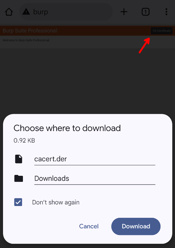 On this Android version, you have to press *Install Anyway* to start selecting a certificate file from your *Downloads*. Choose the `cacert.der` file from Burp Suite.\