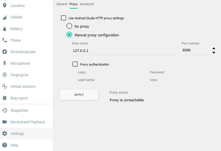On the right you should see a bar of options and ![](https://3698848315-files.gitbook.io/~/files/v0/b/gitbook-x-prod.appspot.com/o/spaces%2F677wrA8ZfiPs1U4l5uR6%2Fuploads%2FlV0SpNAyj1Kcx2H3A11j%2Fimage.png?alt=media\&token=0e5361d5-dba9-4b91-9157-73ecdffbdbbf) three dots for more options. Click it and visit **Settings** -> **Proxy**. Here you can set a **Manual proxy configuration** to the IP address and port of your proxy. You will likely need to configure an external address because localhost points to the device itself, not your host.