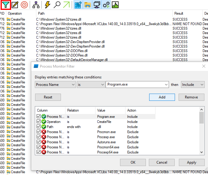 Any of these will probably work, but `MyLibrary.dll` seems custom and most likely, so we'll focus on that. To find out what libraries are actually loaded we can dynamically analyze it by running it locally and attaching [Process Monitor](https://learn.microsoft.com/en-us/sysinternals/downloads/procmon), then looking for *CreateFile* events with `.dll` extensions: